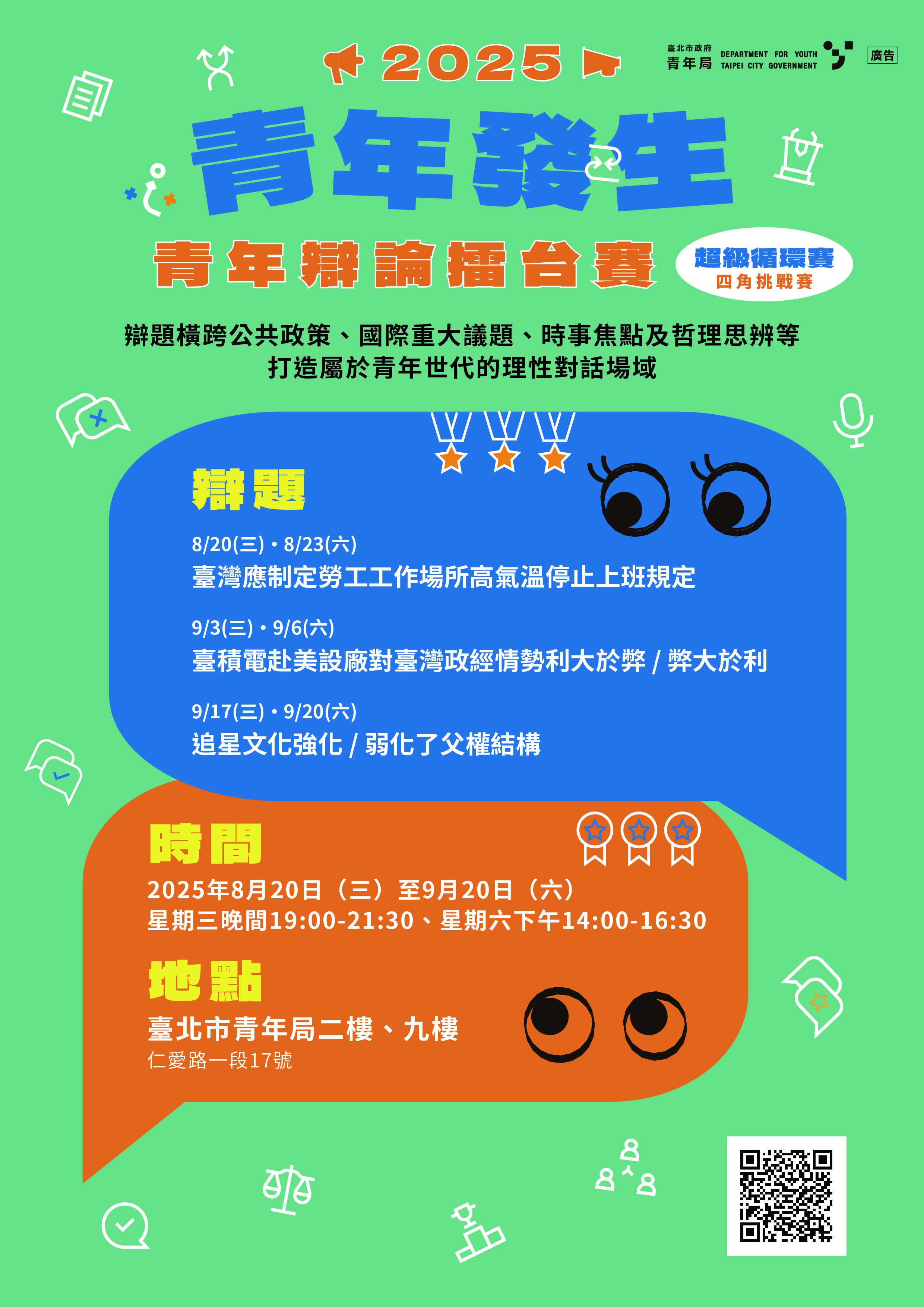 校園公告 公告主旨 「青年發生」2025青年辯論擂台賽-超級循環賽,無須報名,免費參與觀賽 !!! 發佈日期 2025 年 9 月 03 日 發佈單位 訓育組 公告類別 最新消息 公告等級 轉知 點閱次數 167 公告內容 相關附件 【2025-09-03】連江縣114年第三屆國際藝術島宣導,歡迎體驗馬祖風情!!! 【2025-09-03】國立臺中教育大學「本土語教學語言研究發展中心計畫」編製之「台 ...