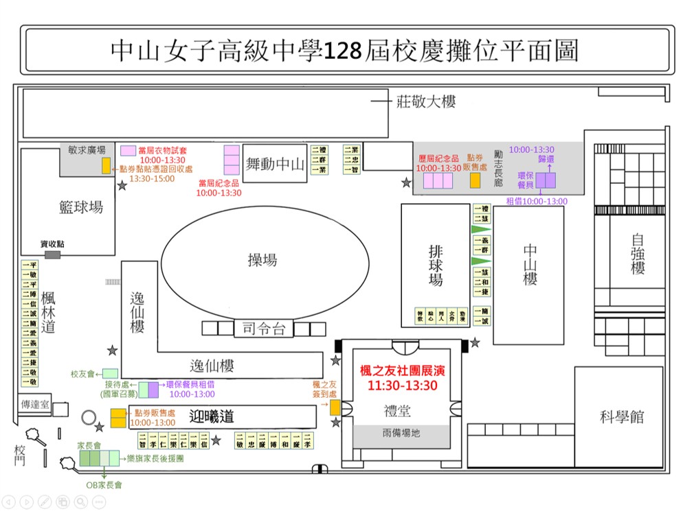 校園公告 公告主旨 【128週年校慶】班聯會辦理之校慶「園遊會」重要事項時程表 發佈日期 2025 年 11 月 12 日 發佈單位 訓育組 公告類別 最新消息, 校慶 公告等級 無 點閱次數 5,423 公告內容 ※相關事項詳見128週年校慶園遊會實施計畫(1026) 園遊會-重要事項時程表 128校慶各班攤位位置圖(含社團) 相關附件 【2025-11-13】臺北市114學年度第1學期跨教育階段藝術才能(資優)舞蹈班教師專業 ... 【2025-11-12】【代班聯會公告】11/13-14「第28屆楓之聆比賽」(歌唱組+舞蹈組)- ...
