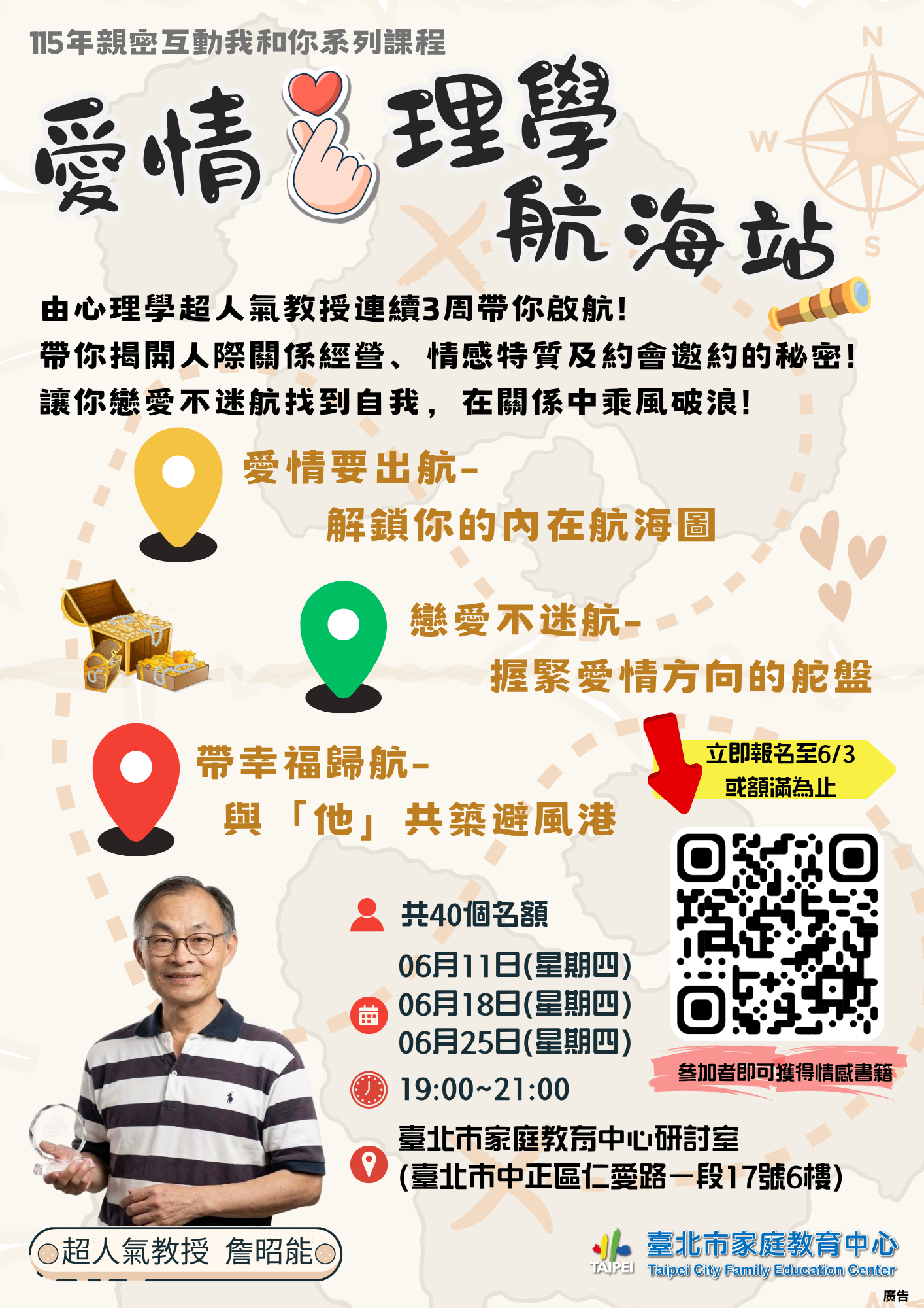 校園公告 公告主旨 台北市家庭教育中心辦理親密互動我和你系列課程–愛情心理學航海站課程 發佈日期 2026 年 4 月 29 日 發佈單位 輔導室 公告類別 最新消息 公告等級 轉知 點閱次數 22 公告內容 一、課程以人際關係及情感互動為題,藉由講師互動分享、小組討論等方式,探討人際關係經營、情感特質、約會邀約及拒絕等內容,對象為一般市民,全程參與之公務人員可申請終身學習(研習)時數6小時。 二、活動時間為115年6月11日、6月18日及6月25日,連續3週於星期四晚間7時至9時,報名自即日起至6月3日或額滿為 止,名額共40位,額滿採候補報名登記制,報名連結如下:https://forms.gle/pY1wnefH1LRKfemn8。 相關附件 【2026-04-29】教育部辦理「115年度515國際家庭日宣導及系列座談活動」 【2026-04-29】【轉知】國立中興大學「2026高中生前瞻科技探索—機械跨域創新論 ...