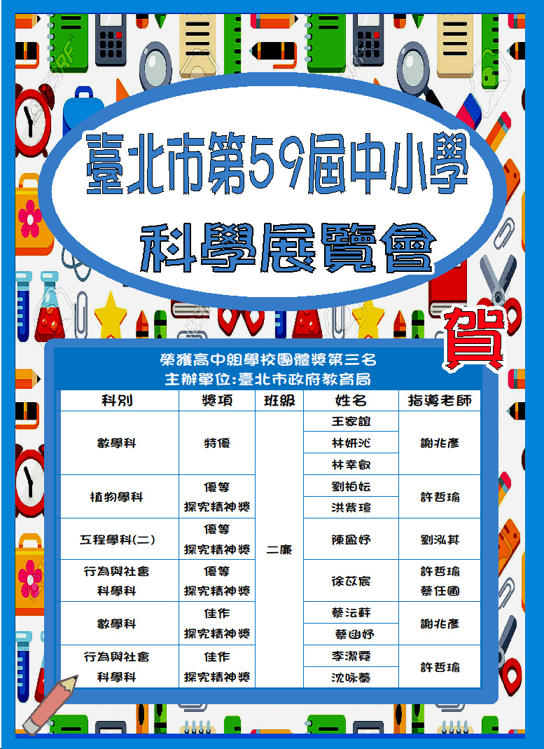 校園公告 公告主旨 狂賀!!本校參加臺北市政府教育局主辦臺北市第59屆中小學科學展覽會成績優異!!榮獲高中組學校團體獎第三名與特優、優等及佳作♪♪ 發佈日期 2026 年 4 月 20 日 發佈單位 設備組 公告類別 最新消息, 榮譽榜 公告等級 無 點閱次數 212 公告內容 狂賀!! 本校參加臺北市政府教育局主辦臺北市第59屆中小學科學展覽會成績優異!!榮獲高中組學校團體獎第三名與特優、優等及佳作♪♪ 恭喜得獎同學及感謝指導老師辛勤指導♪♪ 相關附件 【2026-04-20】【教甄】115學年度第2次教師甄試初試注意事項 【2026-04-20】114學年度教育盃中小學藤球錦標賽