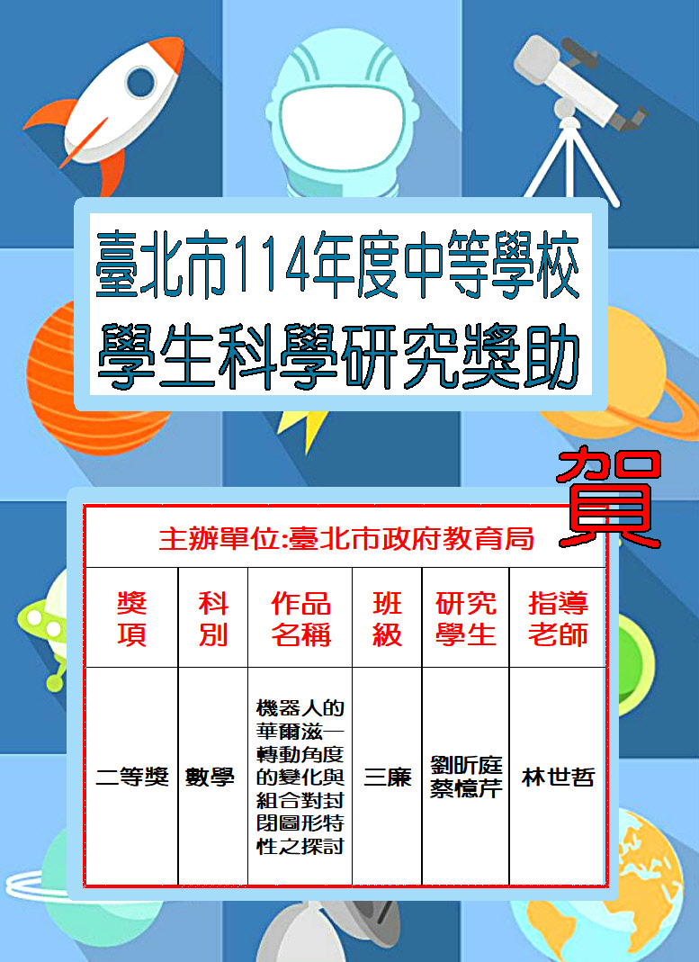 校園公告 公告主旨 狂賀!!本校參加臺北市政府教育局主辦臺北市114年度中等學校學生科學研究獎助成績優異!!榮獲二等獎!! 發佈日期 2025 年 10 月 17 日 發佈單位 設備組 公告類別 榮譽榜 公告等級 無 點閱次數 40 公告內容 狂賀!! 本校參加臺北市政府教育局主辦臺北市114年度中等學校學生科學研究獎助成績優異!! 榮獲二等獎!!恭喜得獎同學及感謝指導老師辛勤指導♪♪ 相關附件 【2025-10-17】【轉知】國立臺灣師範大學「PBL 問題導向學習:教室與野外的實踐」 【2025-10-17】10月19日(星期日)第一次英聽測驗考後消毒作業公告