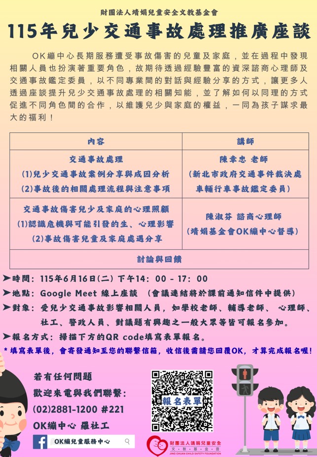 校園公告 公告主旨 轉知:財團法人靖娟兒童安全文教基金會「115年兒少交通事故處理推廣座談」活動資訊 發佈日期 2026 年 4 月 28 日 發佈單位 校安中心 公告類別 最新消息 公告等級 轉知 點閱次數 36 公告內容 轉知財團法人靖娟兒童安全文教基金會OK繃兒童服務中心將於115年6月16日辦理「115年兒少交通事故處理推廣座談」,報名表單詳如附件說明。 相關附件 【2026-04-28】「模糊的網路界線:防制數位性暴力青少年論壇」報名簡章,歡迎有 ... 【2026-04-27】【114學年度第2學期】高一二數學第二次點燈計畫