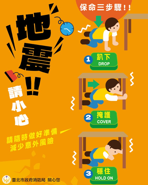 校園公告 公告主旨 轉知:消防局114年9月份防災宣導素材,請踴躍點閱並謹慎防災。 發佈日期 2025 年 9 月 03 日 發佈單位 校安中心 公告類別 最新消息 公告等級 轉知 點閱次數 248 公告內容 平時請固定家具,準備物資與緊急避難包。 地震時,立即執行抗震保命三步驟:趴下、掩護、穩住,切勿搭乘電梯。 有任何狀況撥打1999或119通報。 災後若建物受損不宜居住,請前往鄰近避難收容處所避難。 相關附件 【2025-09-03】教師研習中心第16期教師支持陪伴團體實施計畫 【2025-09-03】教育部體育署114年度高級中等學校體育班師資增能工作坊