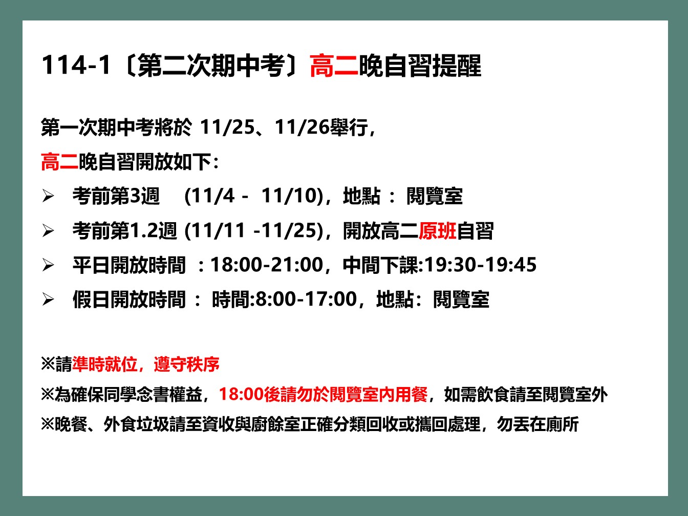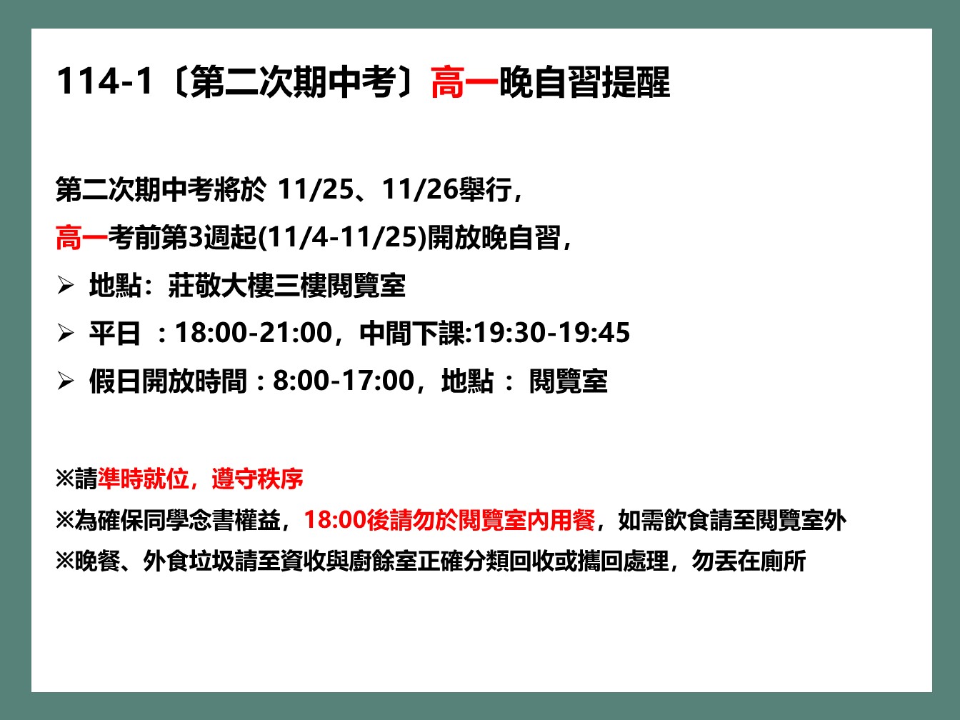 校園公告 公告主旨 [114學年度第1學期] 高一高二 第二次期中考晚自習提醒(114/11/4-114/11/25) 發佈日期 2025 年 10 月 31 日 發佈單位 教學組 公告類別 最新消息, 學生專區, 教師專區 公告等級 重要 點閱次數 174 公告內容 相關附件 114-1第二次段考晚自習(高一) 114-1第二次段考晚自習(高一) 檔案名稱檔案大小檔案格式下載114-1第二次段考晚自習(高一).JPG173.42 KB新視窗開啟檔案 114-1第二次段考晚自習(高一).JPG 114-1第二次段考晚自習(高二) 114-1第二次段考晚自習(高二) 檔案名稱檔案大小檔案格式下載114-1第二次段考晚自習(高二) .JPG195.17 KB新視窗開啟檔案 114-1第二次段考晚自習(高二) .JPG 閱覽室開放晚自習使用規範 閱覽室開放晚自習使用規範 檔案名稱檔案大小檔案格式下載閱覽室開放晚自習使用規範.jpg186.57 KB新視窗開啟檔案 閱覽室開放晚自習使用規範.jpg 【2025-10-31】景美高中辦理「未來人才的必修 課:與AI共學、共創、共進」研習 【2025-10-31】【轉知】2025中學教師物理探究暨演示實驗研習會-從量子看世界, ...