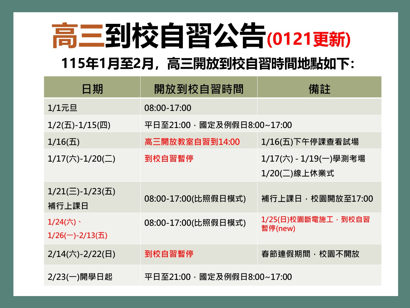 校園公告 公告主旨 115年高三晚自習開放時間提醒(1-2月)(1150121更新) 發佈日期 2026 年 1 月 13 日 發佈單位 教學組 公告類別 最新消息, 學生專區, 教師專區 公告等級 重要 點閱次數 807 公告內容 1/21(三)更新:配合校園斷電施工,1/25(日)到校自習暫停 相關附件 115年1-2月高三到校晚自習提醒(0121修) 115年1-2月高三到校晚自習提醒(0121修) 檔案名稱檔案大小檔案格式下載115年1-2月高三到校晚自習提醒(0121修).jpg223.92 KB新視窗開啟檔案 115年1-2月高三到校晚自習提醒(0121修).jpg 【2026-01-13】【高三升學】台南家專學校財團法人台南應用科技大學115學年度招 ... 【2026-01-13】【高三升學】德明財經科技大學115學年度日間部四技運動績優學生 ...