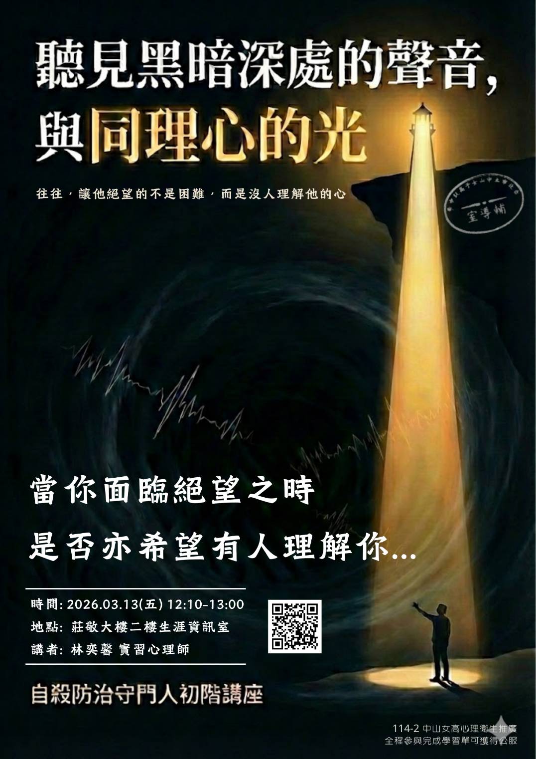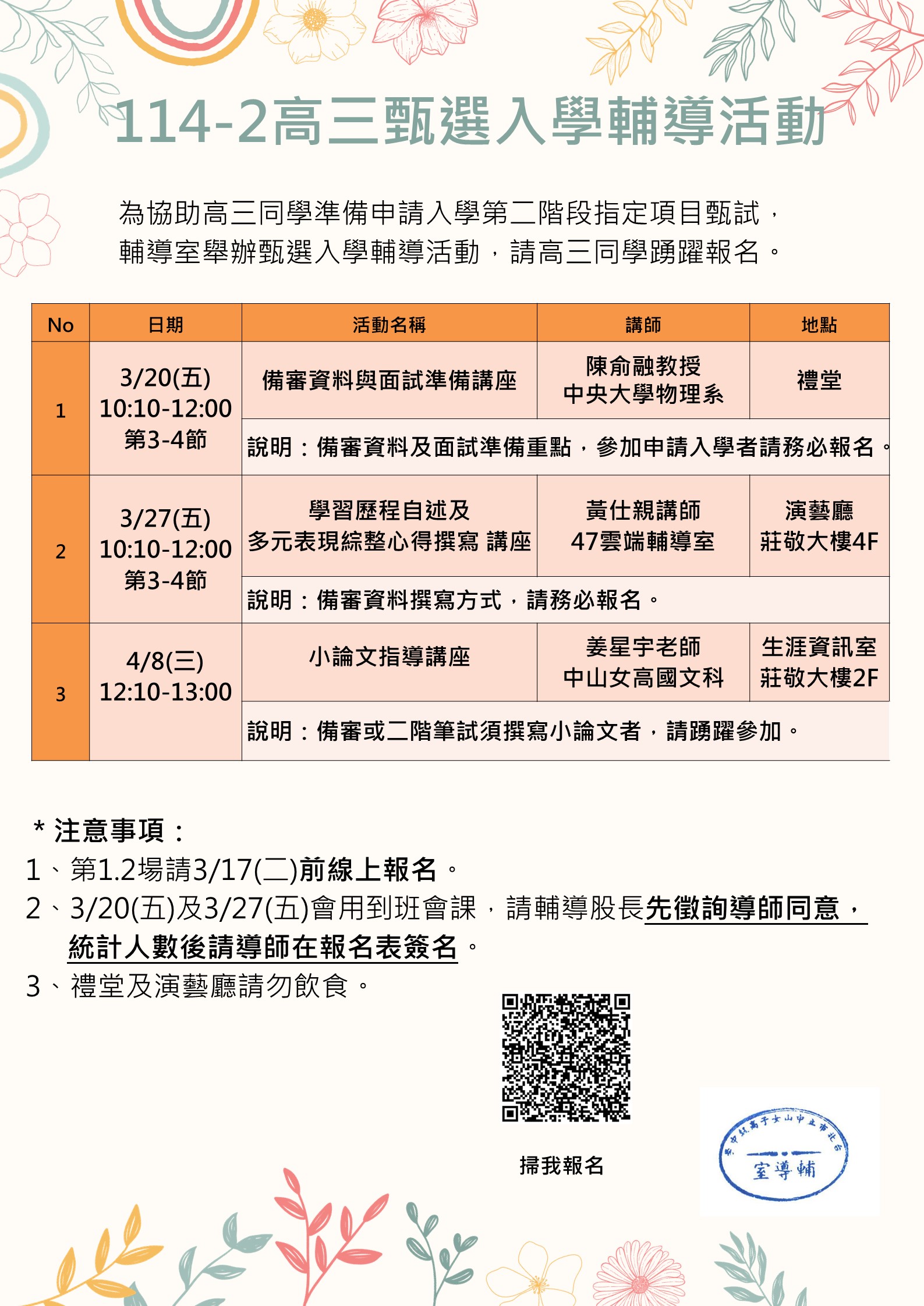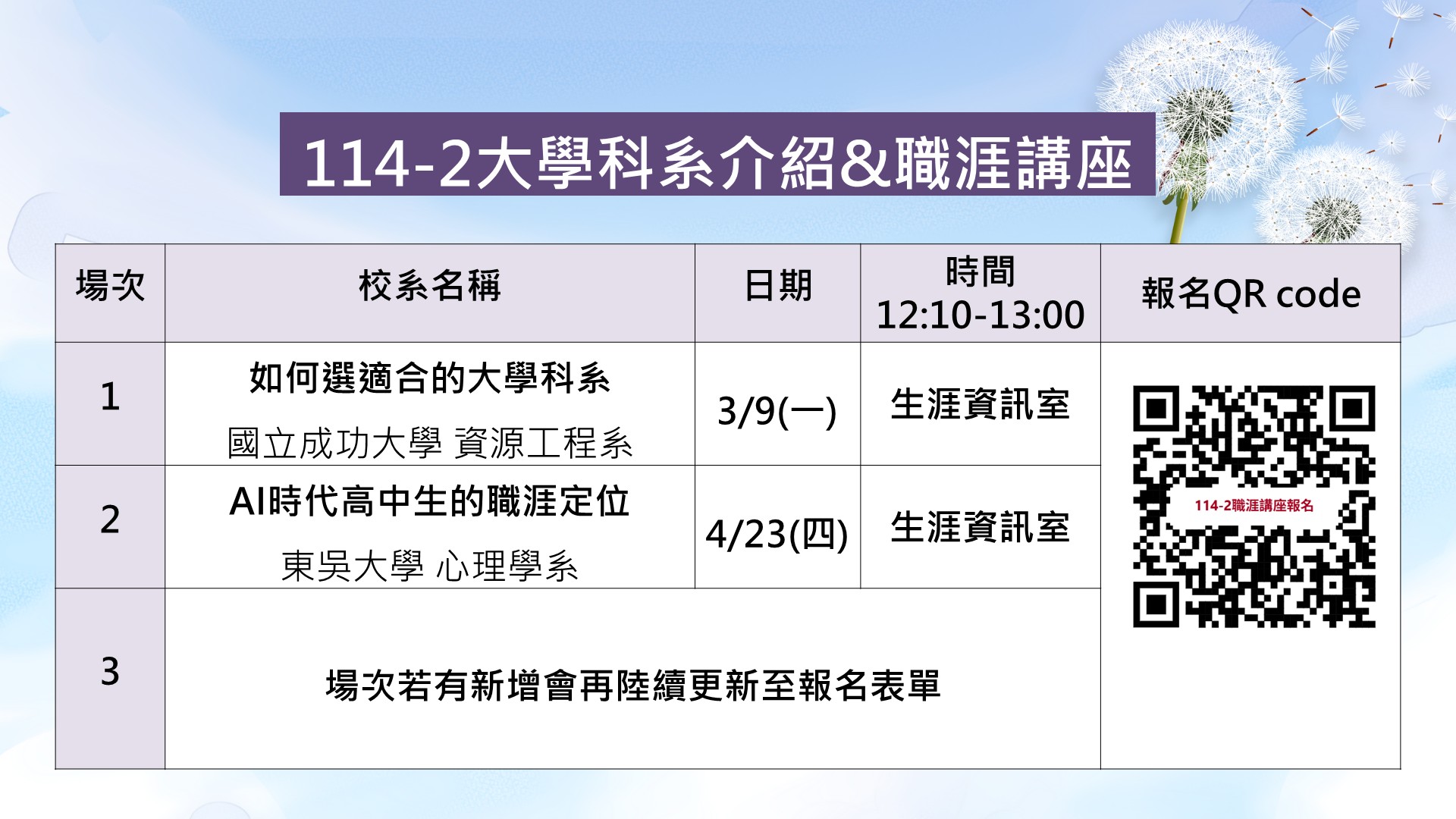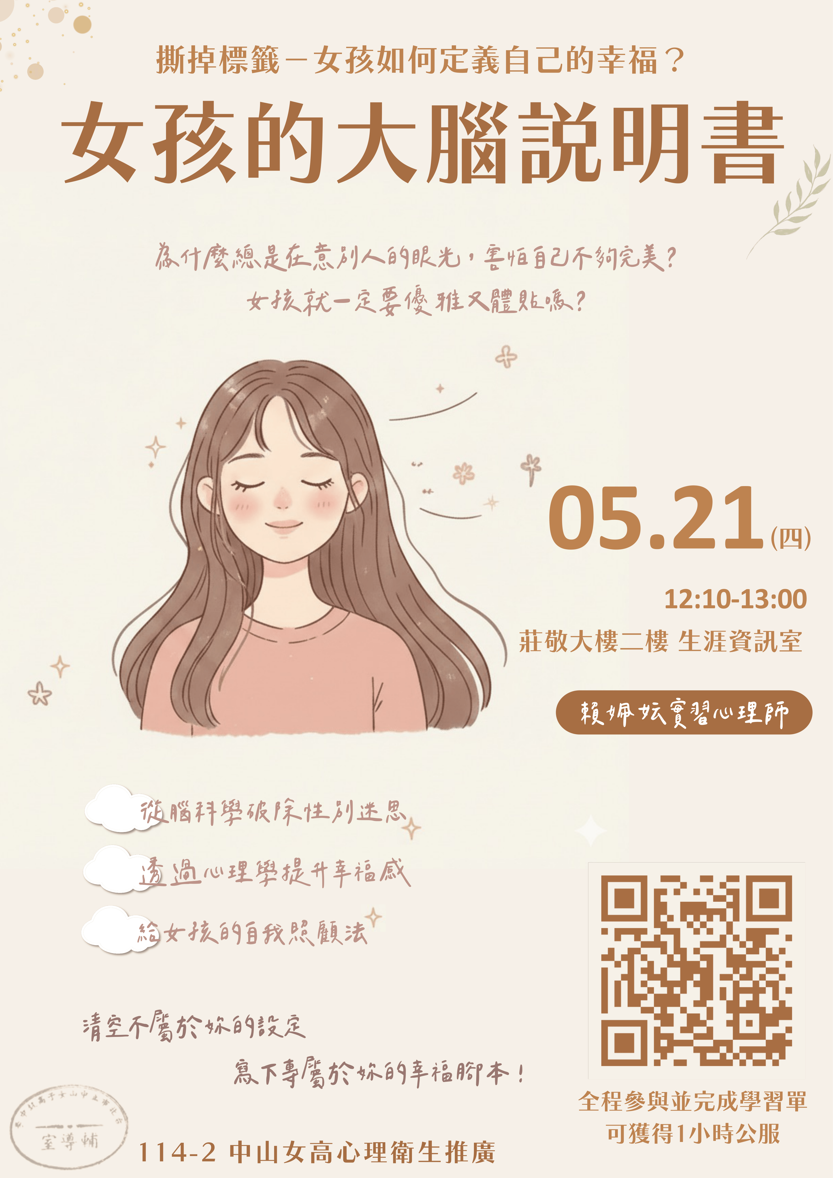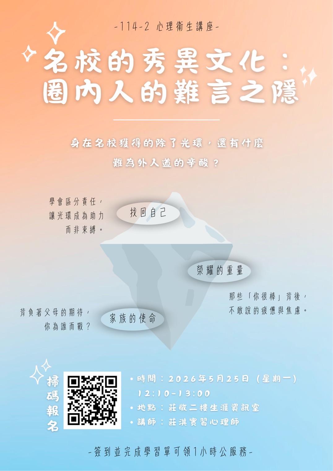 【114-2参與輔導室各項講座(除牌卡諮詢),填寫心得回饋表,和1位師長及2位同學分享,可以至輔導室領取1小時公服條。】